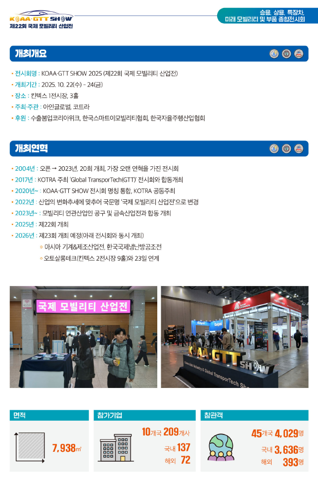 완성차 구매 및 연구인력, 부품/소재/용품 제조사, 수입 및 유통기업, 운송업계, 정비체인, 전자/IT/화학/철강/기계 등 모빌리티 연관산업계, 스타트업, VC 등 모빌리티산업 서플라이 체인 전반과 정부기관, 학계, 언론에서 귀사의 관련 제품과 기술을 보기 위해 방문합니다.